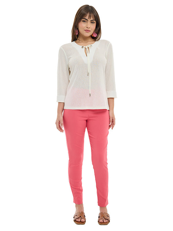 Blusa para mujer confeccionada en material jersey suave y cómodo, con diseño liso que permite múltiples combinaciones. Su manga 3/4 aporta un estilo elegante y funcional, mientras que el detalle con aplicación añade un toque moderno y distintivo.