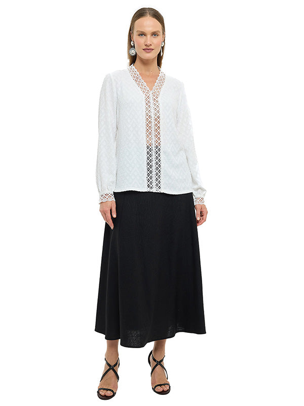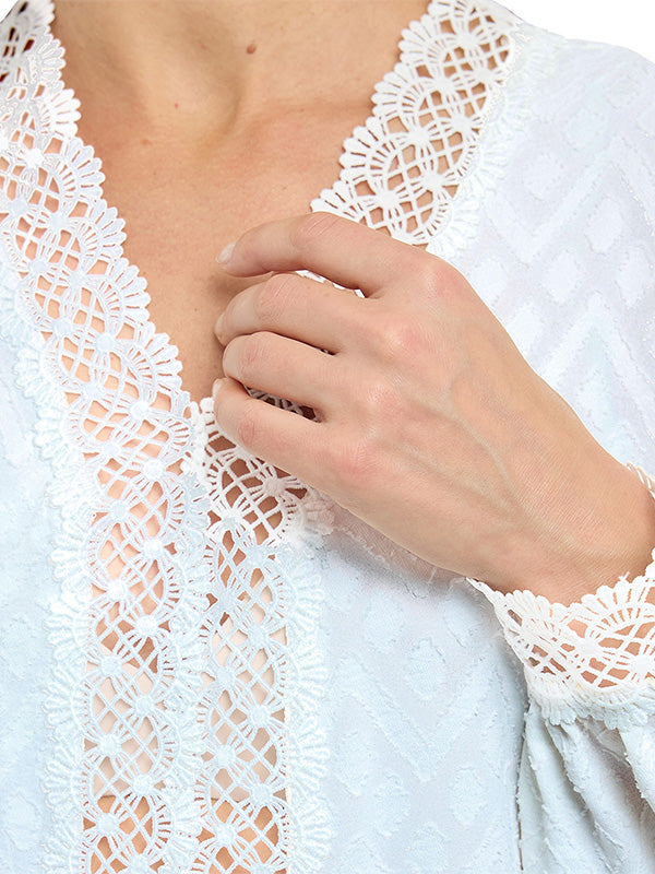 Blusa de manga larga con diseño femenino y delicado. Incorpora aplicación de crochet en puños y escote, aportando textura y un detalle artesanal que realza la prenda. Su silueta versátil la hace ideal para combinar con pantalones o faldas, perfecta para lograr looks elegantes con un toque romántico y sofisticado.