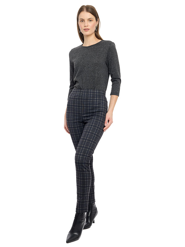 Pantalón confeccionado en material super ponti, cómodo y elástico para todo el día. Presenta un diseño estampado de cuadros que aporta estilo y modernidad. Su silueta con pinzas realza la figura, mientras que el corte de cintura media y la pierna skinny ofrecen un ajuste favorecedor y elegante. Ideal para combinar con blusas, camisetas o sacos, tanto para looks casuales como formales.