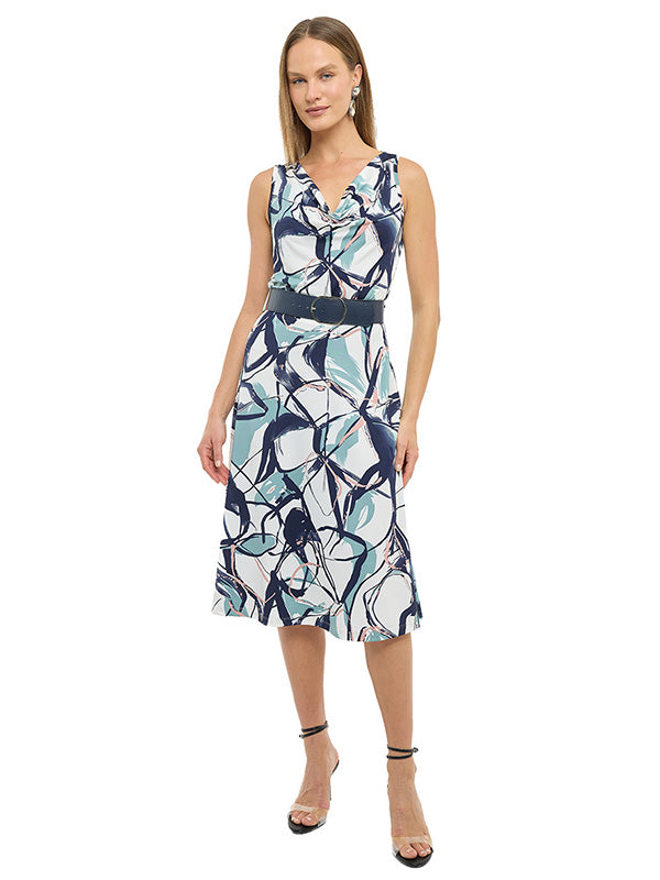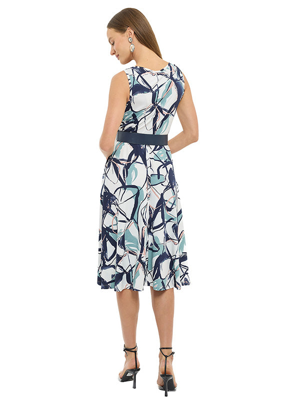 Vestido confeccionado en suave material jersey, con diseño estampado multiformas que aporta un estilo moderno y dinámico. Su silueta circular ofrece una caída fluida y favorecedora, mientras que el cuello drapeado añade un toque elegante. Diseño sin mangas y largo 3/4, ideal para distintas ocasiones. Incorpora forro en la falda para mayor comodidad y mejor ajuste.